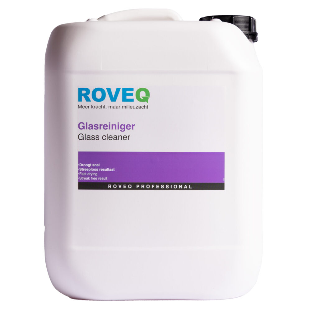Bestel de ROVEQ Glasreiniger 10 liter voor het veilig en efficiënt reinigen van glas en plexiglas. Dankzij de speciale formule reinigt u moeiteloos ramen, spiegels en vitrines zonder strepen of blauwe waas. Naspoelen is niet nodig: aanbrengen, afnemen met een droge microvezeldoek en klaar.